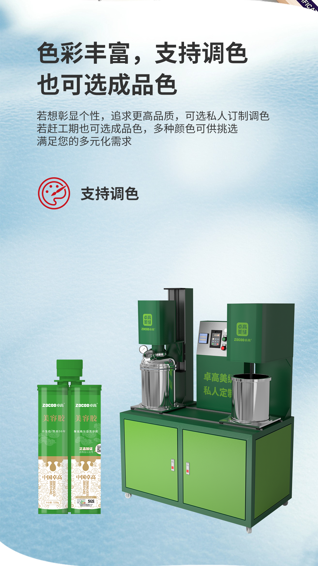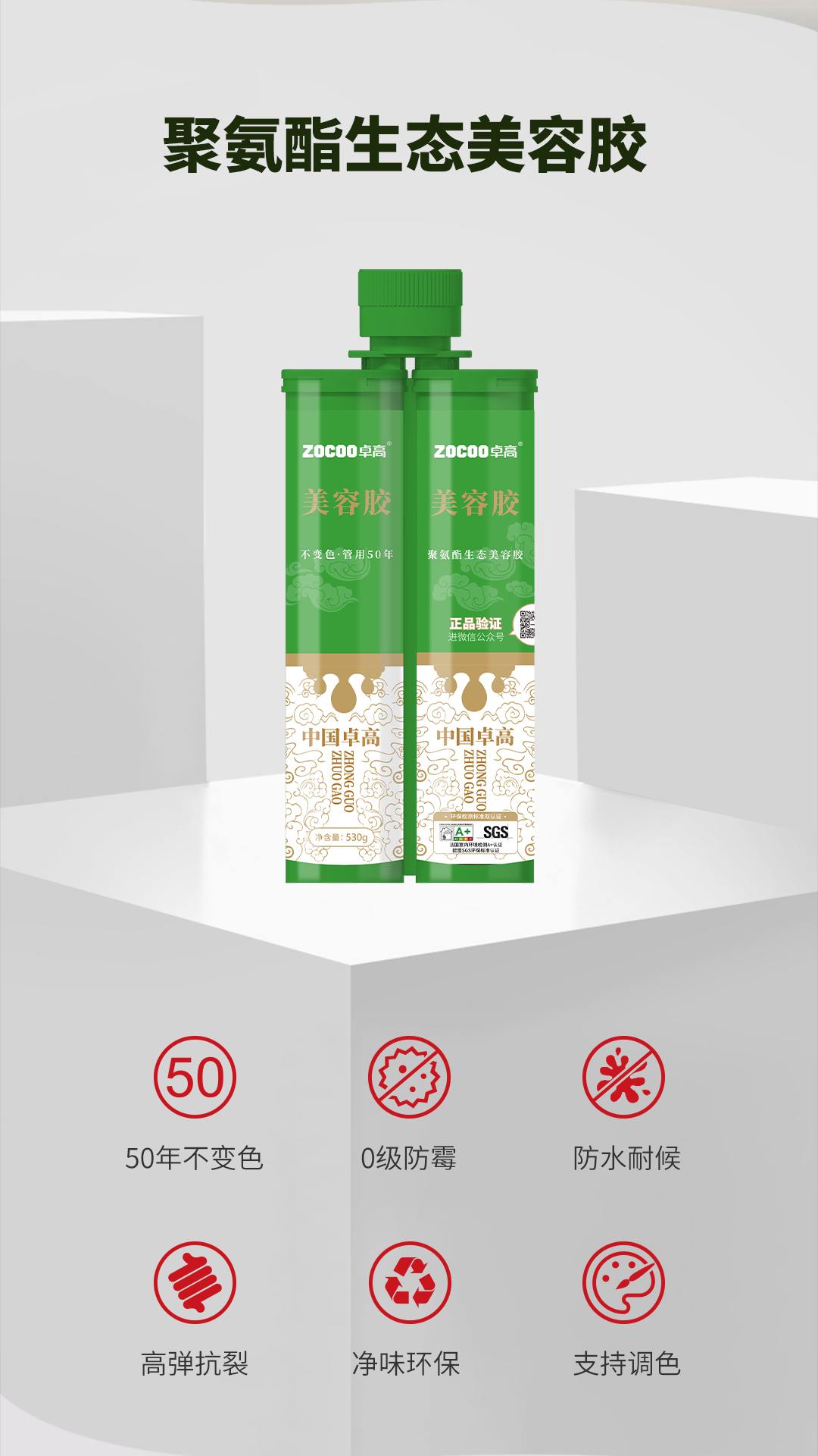 产品特点:全新升级配方,可做调色的美容胶,50年不变色,防霉,抑菌,防水,耐污